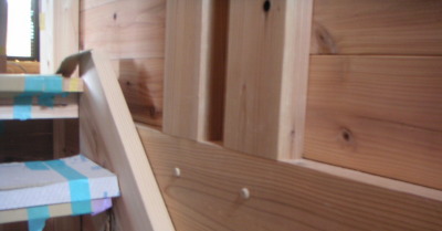階段横のポッチは込み栓(材質は樫)。これを打ち込んで梁と柱を緊結している。我が家では極力材の緊結には補強金物では無く、込み栓を使う設計になっている。これは、「木はできるだけ木で締めるのが一番」という考え方。 この込み栓、実は補強金物にひけを取らない強度があるそうで、なおかつ材の表に金物が出ないので我が家のような真壁の家には最適だ。最近ようやくその効果が認められて使えるようになったらしい。数年前に建てられたオカ所長のご自宅では使う事ができなかったそうだ。 |