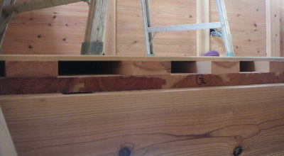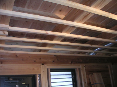 我が家の床の構造。今は階段横から見る事ができる。まず梁の上に、壁で使っているものと同じ板倉の板を敷く。その上にバラ板を等間隔で敷いてその間に各種配線を設置。その上に防音対策用の石膏ボードを張る(ここまでが←の写真)。最終的にはこの石膏ボードの上に仕上げ用の板倉板を貼る。 | |