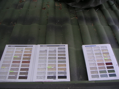 GW明けからは外部モルタルを塗り始める。その為家の外壁の色をそろそろ決める必要がある。色見本の中から今の瓦にあいそうな色を事前に5〜6色ピックアップ。それを実際に屋根の上に載せてみた。これだけでは全体でのイメージがつかみにくいので、ピックアップした色でより大きなサンプルを作ってくれるので、それで最終的に色を決める。 |