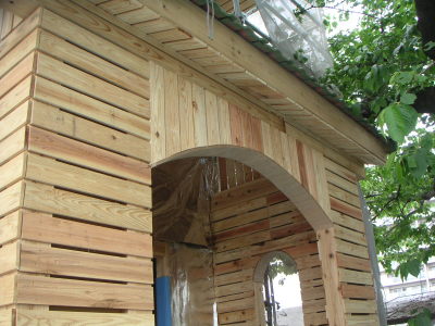岡所長よりメールあり。外壁の防水工事が終ったとの事。外壁全面が黒い防水シートで覆われた。これからこの上にモルタルを塗っていく。 |