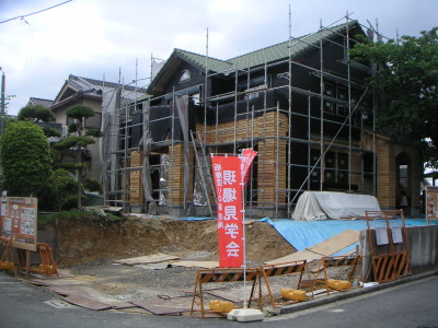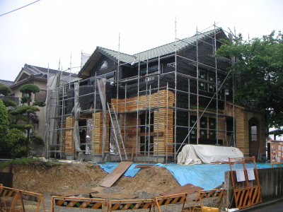 施工を担当しているYG工務店の頑張りにより、オカ所長が想定していた工程よりも現場は早く進んでいる。「外部のバラ板などは材料が無くなって、あわてて中千木材に材料追加発注掛けました」とはオカ所長の談。実際、M棟梁とY兄大工の働きぶりは凄い。朝は9時前からかなづちの音が鳴り始め、昼の1時間の休憩と10時と3時のお茶休憩以外で二人が一休みしている姿を見た事がない。夕方も日が暮れ始める6時過ぎでも作業している事多々ある。作業の出来栄えも丁寧で、釘打ちなども「これでもか」と言わんばかりにきっちり打ち込んでいる。