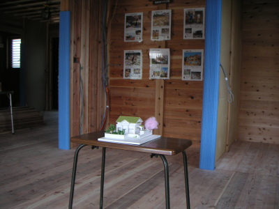 前日現場が終った後夜8時頃まで掛けてHさんとUさんが掃除をしていたお陰で、中はとても綺麗。うまく押入れのスペースを利用してパネルを展示している。保管していたHさんとUさんの力作・我が家の模型も展示。 | |