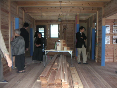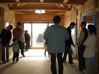 予定時刻の2時過ぎ、続々と見学者がやってきた。半分はご近所さん、そして半分が丹陽社が配ったチラシを観たり4月の見学会時に来ていたメンバー。施主としては、半年掛けて打合せを重ねて、ようやく形になってきた我が家を他人がどう評価するのか、気になるところである。 | |