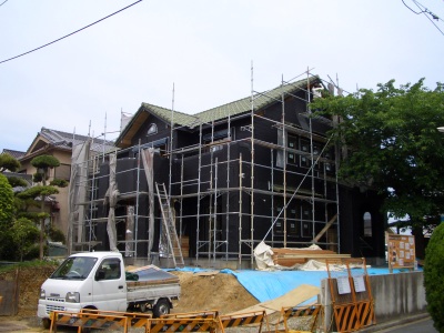 母の日。子供の幼稚園で母親参観があったので、それに参加がてら現場を見に来る。遠くから我が家の外観を観て「あれ??」。先週までは遮熱シートの銀色とバルコニーの木目のツートンカラーだったのが、この日は黒と木目のツートンカラーになっていた。