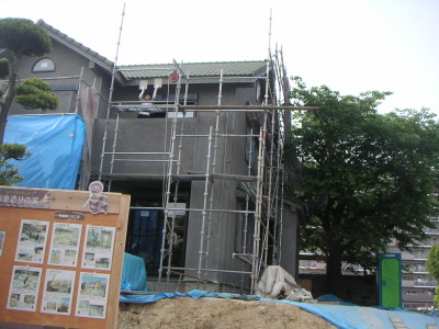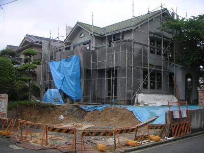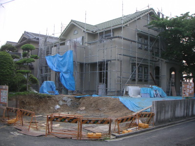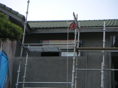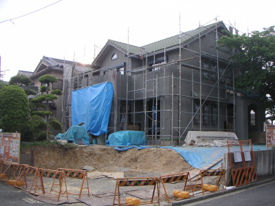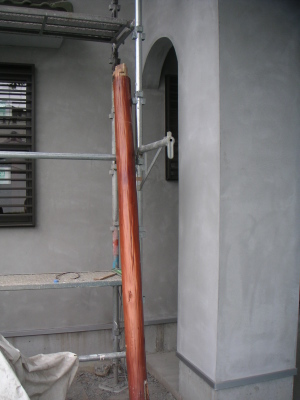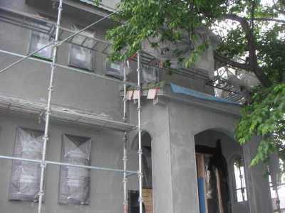 外部モルタルは再度上塗りをして、綺麗に仕上がっていた。これはこれで結構綺麗。この後先週選んだ塗料を吹き付けたら、足場をばらして外構に着手するとの事。 |