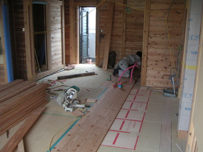 M棟梁、相変わらず鼻歌まじりに着々と作業をこなす。この日は仕上げ用の床板を張っていた(床板を張り終えた箇所は傷がつかないように養生シートを上から張っている)。床板の一部は塗装するのだが、当初作業所で塗装してから張る段取りと聞いていた。この日オカ所長に聞いてみたら作業性の問題で施工後まとめて塗装する事になったとの事。 | |