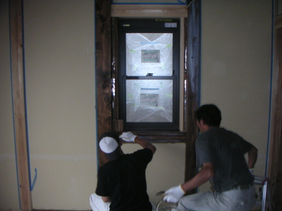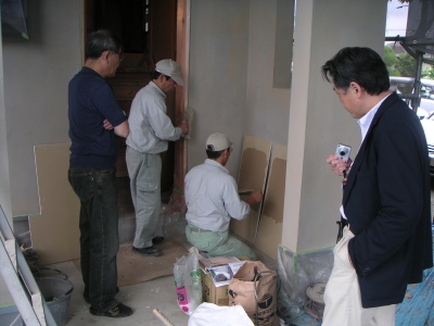 午前中現場に到着。この日はYG工務店Y社長、M棟梁、Y兄大工にプラス、左官屋の二人、そして塗装屋の二人の合計7名の職人さんが現場で所狭しと作業をしていた。全く違う職種(大工・左官・塗装)がお互いうまく現場で作業していて、観ていて全くあきない。 珪藻土を塗る壁には石膏ボードを貼り、そこに下地を塗り込んでいく。ちなみに左官のお二人は親子だとか。 | |