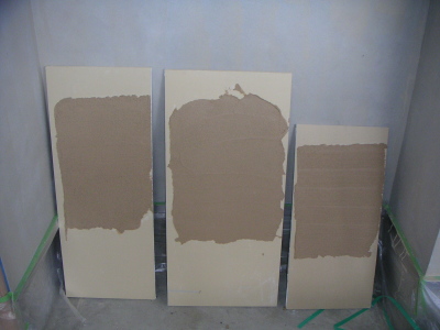 仕上げのテクスチャー比較。左から、「木ごてひきずり」、「こてなみ残し」、「くしびき」。希望として親世帯は極力こての跡が残らない施工、私達子世帯はあまり自己主張しすぎない程度にこて跡が残る仕上げ。私達は「木ごてひきずり」で仕上げて貰うようお願いした。ちなみに珪藻土塗りたてだとこんな土色をしているが、時間とともに白っぽくなっていくそうだ。 | |