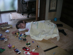 現場での打合せの最中、珍しく息子がグズったので怒って実家に連れて帰った。打合せが終って戻ってみるとおもちゃで遊びながら力尽きて寝てしまっていた。