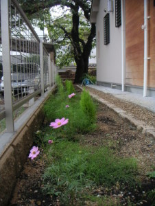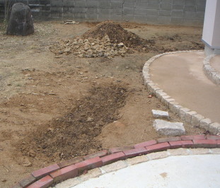 現在東・北・西の目処をつけ、最難関の南の庭の土壌改良に取り組んでいる。が、これがなんとも手強い・・・。なにせ10cmも掘るとカチカチの粘土質。これをなんとかしないととても緑が育つような環境にはならない。粘土質をショベルで掘り返し、それを細かく砕いて天日乾燥させる。一方でホームセンターの腐植土等を購入してきて、丹陽社が庭に敷いてくれていた真砂土と粘土質を砕いた土とを混ぜて寝かし、それを埋め戻す・・・という事を繰り返す。気の遠くなるような作業を毎週末毎に行っているのだが、いったいいつになったら豊かな庭になることやら・・・。 |