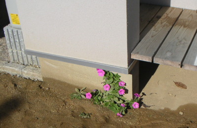 そんな不毛の庭にも雑草の花が咲いた。真冬なのに逞しく可愛く咲き続けている。何の花かなあ・・・。