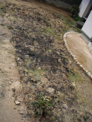 昨日の大雨の後・・・。冬の間必死で土壌改良を続けてきたがやっぱりこの通り。見渡す限りの池になっている。粘土質の土を掘り起こし、腐葉土をまぜ、水はけを良くしたつもりだったが、中途半端に雨が染み込むようにした為に、保水しきれなくなると前以上に池になってしまう。 それでもなんとか一定の深さまで耕したので、ここにはもうすぐ芝生を植えるつもり。植物の力を借りないとこの庭は息をふき返すのは難しそうだ。 |