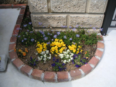 玄関横に植えたパンジー等は真冬の間も元気に咲き続け、今もこんなに元気に。砂漠のようだった昨年の7月から少しずつ緑が増えていっている。