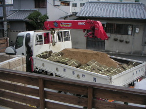 ・28日(土)夕方 今回、高麗芝と土は澤野園に手配した。高麗芝の束はホームセンターでも売っているが、それよりも大判のものを入手して貰った。土は真砂土。植える前に敷く為の土と、植えた後芝の上からまく為の目土。合計2m3分。2tトラックに山盛りで到着。 |