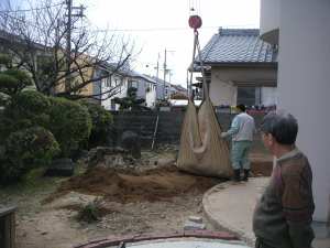 クレーンで庭まで運んで貰う。土は思っている以上に重いのだそうで、実際作業中一度トラックが浮き上がりそうになった(怖かった・・・)。ちなみにホームセンターでも土は売っている(実際冬の間はホームセンターで腐葉土を買ってきてはせっせと庭にまいていた)。でも今回と同じだけの量をホームセンターで買って持ってこようと思ったら、2000kgなので1袋5kgとして合計400袋!?10袋づつ愛車に積んで往復するとなると40往復・・・・。この手間考えたら今回まとめて澤野園に頼んでおいてつくづく良かった。 | |