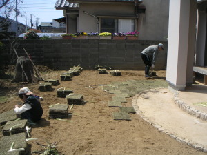 食事後更に芝を並べていく。目地は2cm程度開けて、交互になるように。並べ終えたら、残った真砂土で目地を埋めていく。 | |