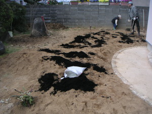 ・29日(日) ここからはDIY。10時、父・私・息子の3世代で作業開始。まずは真砂土を庭にまんべんなく広げる。これが結構難しい。勾配も考えながらならしていくには結構な労力がいる。 |