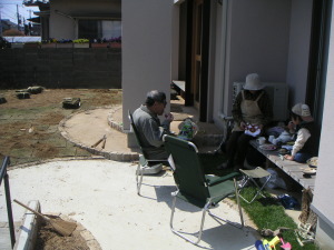 作業を始めて3時間弱。母と嫁さんがおにぎりを作ってくれた。皆で縁側で食事。 | |