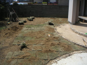 バーグ堆肥をまぜた後、先程よりも更に厳密に土をならしていく。なかなか思い通りの勾配にならずこれが一番時間の掛かる作業となった。ある程度で妥協し、芝の束を配置。位置を決める為に取り敢えず縁側前から芝を並べ始める。息子も紐の片付け等を手伝う。 | |