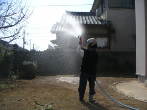 目土をかぶせたところで、芝の裏側まで染み込む程たっぷりと散水。竹の時もシマトネリコの時もそうだが、植物を移植した際にはたっぷり水をやるのが基本のようだ。 | |