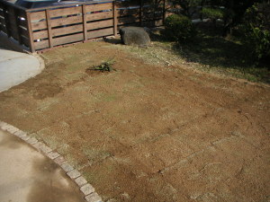 4時、作業終了。大人2名+子供1名でたっぷり6時間掛かった。出来栄えは素人にしてはまあまあか?2週間程は立入り禁止にして根付くのを待つ必要があるそうだ。高麗芝は植える時期としては今が一番のタイミングだとか。うまくゆけば夏にはフカフカの芝生になっている・・・はず。 |