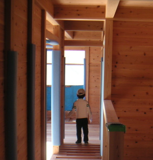 我が家を建ててくれた丹陽社が、大阪市内に板倉の家の構造見学会をするとの話を聞き、見学させて貰いに行った。板倉の家の建て方現場を観るのは1年半振り。中に入ると心地良い木の香りがした。我が家も同じ材料を使っているんだけれど、1年半経つとだいぶ香りも落ち着いてくる(初めて我が家に来た人は「木の香りがするねえ・・・」と言ってくれるのだが)。誕生間近のこの香りはこの時期しか楽しめない。なんだか懐かしい感じがした。