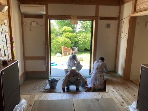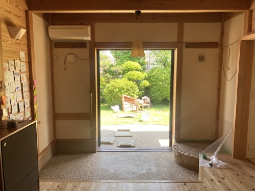 連休明け5月、まず最初に手を付けたのは1階土間とポーチ。土間は施工当時タタキ仕上げだったのだが、うまく土が固まらずに砂になって、人の出入りで埃が舞う状態になっていた。在宅勤務はミミオヤジの書斎を借りていて、1階が日常生活空間に戻っている。 環境改善の効果は大きく、着手する事にした。