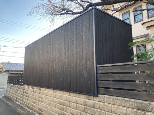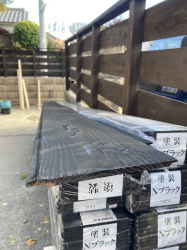 今回の焼杉素材。納期の関係で当初予定していた徳島材では無く広島材になった。断面を観たらきちんと炭化層が形成されている。色目は悩んだが、これまでの板塀が再塗装の重ね塗りで色合いが濃くなっていたのと、耐久性を考えると一番素の状態であるブラックを選択。
