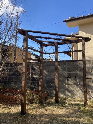 元のブドウ棚は白蟻でボロボロになっていた。キシラデコールで塗ってはいたが、直接地面に接する場所だった事が要因か。初めて観る白蟻の威力に驚く。濡れた状態のままになる事が良くないらしい。新しいブドウ棚は山元さんのところになるヒノキに防蟻塗装を塗ってもらったので(贅沢仕様になった)「大丈夫」との事。