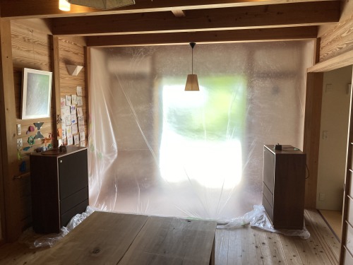 内部は斫りの粉塵が室内にこないように、ビニールで養生。