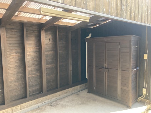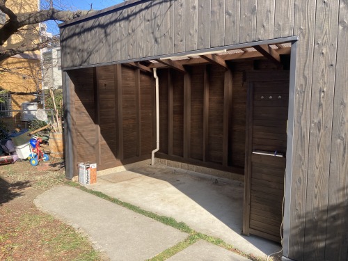 計画段階で素材に拘って自転車小屋と塀も木造にしたものの、建てた当初は「10年持つかな?」と心配していた。 2〜3年に1度シルバーさんにお願いして塗装(キシラデコール)のメンテは継続してきた。それ以外はこれまで補修を特にしてこなかったので、「良く持った!」という印象。でも、これから10年を考えた時に今の良い状態を維持し続けるのは難しそうなのが率直な印象。外壁もそうだが自転車小屋はミミオヤジ、私、ミミ坊三世代のプライベート拠点。今後も良い状態を維持したい。