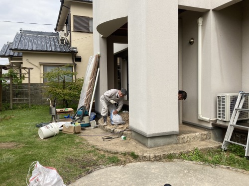 ポーチと土間の下地作業。更新後の”洗い”処理前の下地処理。
