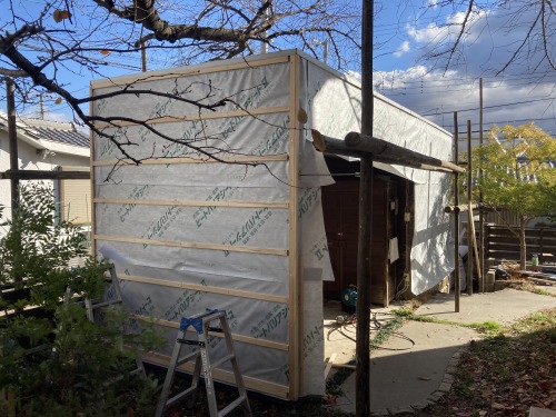あっという間に自転車小屋に透湿シートが貼られた。我が家(本体)を施工している時を思い出す。