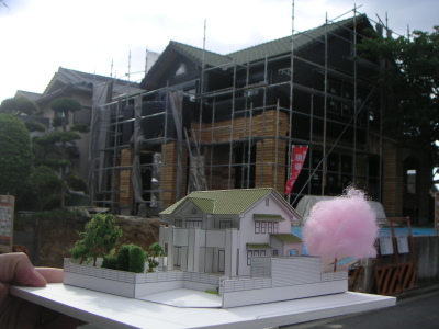 建築事務所が造る模型につき当然縮尺寸法はすべて設計図通りなのは当たり前なのですが、私が驚いたのはその出来栄え。微妙な外観ディティール、瓦の色、バルコニーのRなどが綺麗に再現されている事は勿論、何より我が家のシンボルである桜と、庭の植木、そして極めつけは庭石まで形を1個1個整えて配置されていたのにはびっくりしました。試しに1週間前5月11日段階の現場で、模型を持って写真を撮ってみました(↑の写真。決して合成写真ではありません(笑))。家の外観は勿論、植木の形までそのままなのがお判り頂けるかと思います。・・・丁度その頃、私は計画を家単体だけで考えるのではなく、残した庭があり、地域の環境があり、その中での我が家、という事を意識しだしていた時期だったので、庭の環境をきっちり再現して模型を造ってくれた事が嬉しかったし、私達と丹陽社がちゃんと同じ方向を向いて家造りができているんだ、という事が改めて判って嬉しかったのです。