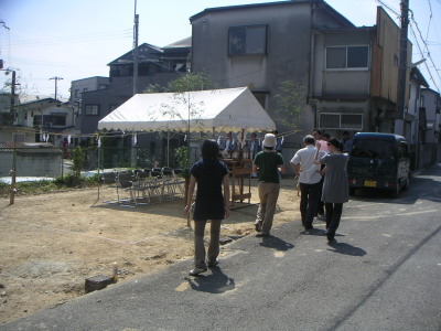 今日、私達家族はある地鎮祭に出席しました。晴天の中アットホームさとピリッとした雰囲気が同居したとても良い地鎮祭でした。3月の私達の時は初めての経験でしたから、何から何まで新鮮でしたが、今回は勝手が判っているので「あ、次は玉串奉献やなあ・・・」とか考える余裕がありました。ゲストとして呼ばれたので気軽に参加できた事もあったと思います。ちなみに、玉串奉献は息子と二人並んで行いましたが、息子が実に上手に出来たのが印象的。息子も3月の地鎮祭の事をよく覚えていたようです。