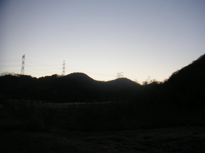 この日は定番コース。自宅〜長尾街道〜上ノ太子〜穴虫峠〜柏原〜大和川。明日香村チャリツーリングの前半部分のコースを走れるので自然と足が向く。難点はこの方面は気温が低い、という事。自転車で走れば体は温まるのだが、手の先と足の先だけはいかんともしがたい。 写真は朝の二上山。穴虫峠の登り始めだがまだ薄暗い。 |