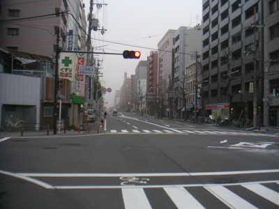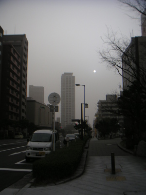 黄砂にかすむ空に、月のような太陽が姿を現す。車のほとんど無い大阪市内。普段の私の知っている大阪とは全然雰囲気が違って、何か別の街に迷い込んだ気分だ。 |
