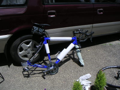 傷がつかないように、ショップから事前に貰っていた発砲スチロールをフレームにまく。その後前輪を外す。 |