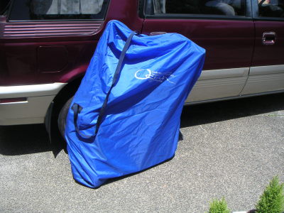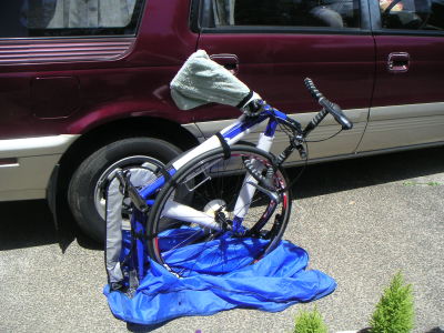 チェーンカバーを取り付けて、ホームセンターで購入したマジックテープでタイヤ、ハンドル等を固定。これで袋に入れる準備は整った。 | |