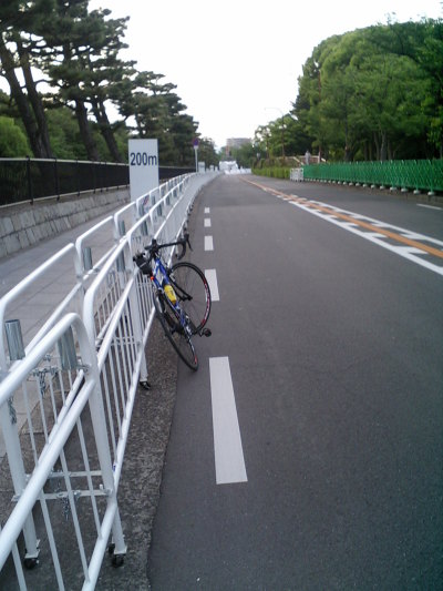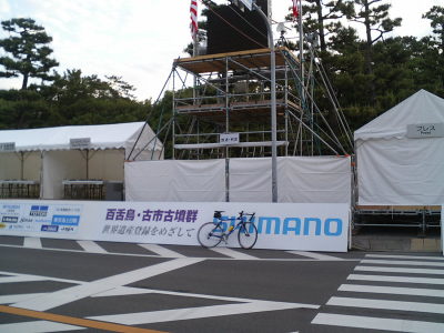 たった2.65kmと言えども、当日はコースをクローズドにしてTTを行う。大仙公園周辺をクローズドにするなんてまずお目に掛かれない。そこで考えた。当日早朝だったらそのクローズドコースを走れるのではないか? 当日朝5時自宅出発し、5時半前にはコース到着。勿論交通規制前なので車は走っているが、コース設営は終わっている。仁徳天皇陵前の道路は柵を二重に設営していて思っていたよりは遥かに本格的だ。仁徳天皇陵参拝所に設定されているスタート・ゴール地点まで200mの所。自転車で二車線の幅なので、充分な広さがある。ここを数時間後選手達が駆け抜けるのである。 暫く正面を見学した後、私もタイムトライアルに挑戦する事にした。たった2.65kmである。昼間の選手に勝負だ、と身の程しらずな勝手TT開始。正面よりスタート。すぐにJRにぶつかって右折。更に数百m走って右折。公園の南東の道は二車線ある。が、1.5km過ぎからメインストレートまでの区間は1.5車線で狭い。去年はTTでは無く通常のレースをしたらしいが、こんな狭い所を集団は走れないでしょう・・・。TTにしたのは正解だ。私はその狭い後半区間辺りから息も絶え絶え・・・。メインストレートは若干の登りでそれもキツい・・・。結局タイムは5分29秒でした。平均速度は約29km/h。これでも普段の私のペースからしたら頑張ったほうだ。 |