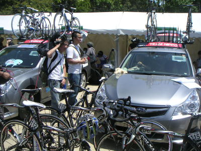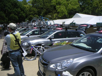 スタート・ゴール地点に設営されたスタンド。ここで大会運営本部及びTT時は放送席になる。勝手TTをしてぜーぜー息をしていたら、ガードマンに話しかけられた。「朝早いですねえ、選手の方ですか(!)」 ・・・選手だったら、たった一周でこんなにゼーゼー息を切らしていませんよ(笑)。とは言わずに「いえいえ、全く初心者なんですけど、レースのコースを試走できると思って走ってみたんです。キツイですね〜」。 ロードバイクの良いところは、ヘルメットかぶって、サングラスをして、それなりの格好をしていたらプロと私のような超初心者と区別がつかない、という事だ。観る人がみれば一発で判るのだろうが・・・。 |