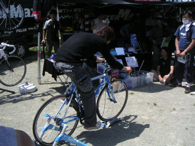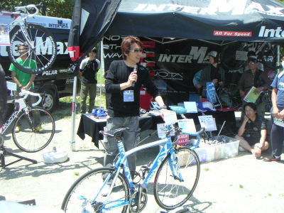 InterMaxのブース。レース開始の30分程前に今中さんのトークショーがあるという。今中さんと言えばロードバイク界の第一人者。どんな話をするのか、どんな人柄なのかとても興味がある。 開始時間を若干遅れて今中さん到着。ロードバイクとは何ぞや?というところから説明。確かにたまたま大仙公園に来ていたおっちゃんなんかもよく判らずに話を聞いていたのでなる程・・・。 |
