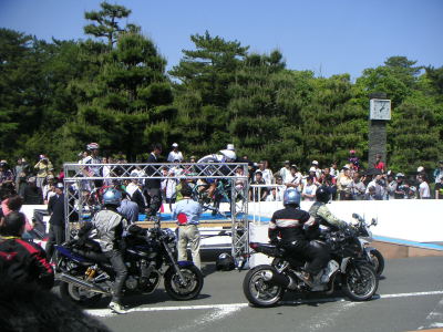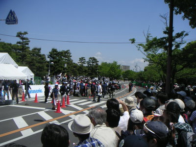 今中さんのトークショーが終わって、TTが行われるコース際に入ってみる。朝とはうって変わって人だかり。予定通り1時半過ぎにTTがスタートした。 | |
