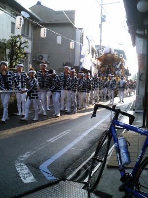 朝5時起床も、外は真っ暗で天気が判らない。前日の天気予報では天候回復は昼前。諦めて二度寝、次に起きたのは6時半。外を観ると気持ちの良さそうな朝日が昇っている。寝坊しての出発は嫌だが、乗れずに後悔するよりはマシだ。あわてて準備をする。路面は思いの他濡れていた。若干空気圧を低めにセットして7時丁度出発。コースは定番の穴虫コース。古市を越えた辺りでだんじりに行く手を阻まれた(トップの写真)。若い女の子や子供が参加して活気がある。穴虫越えは、だいぶスピードに乗せて坂を登れるようになってきた。後半の大和川はパワー不足を改めて実感。まあでも乗れないと思っていたので、もうけた気分の朝駆けであった。