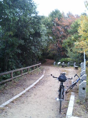 路面は土だが、歩く人が多いせいか比較的フラット。ロードでも問題無く走る事ができた。暫く進むとこの道が尾根伝いに走る道だと判る。木が茂っているので展望一望という訳ではないが、進むにつれて右側には泉北丘陵地帯、左には富田林・河内長野を交互に眺める事ができる。朝7時前後でジョギングをする人も多く、活気がある。それにしても、昔からの古道がこんな展望の良い所を通っているとは驚きである。 府道38号を越えてから木々が無くなり前180度スパーッと展望が開けた。思わず二人ともうなってしまった。こんなに南河内地方の展望が一望できるところがあったなんて・・・。 |