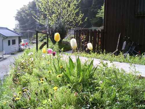 (信貴山近くの集落、民家の土手に咲いているチューリップ)