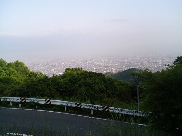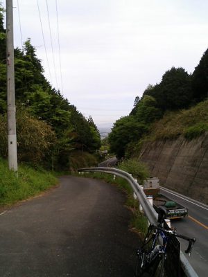 暫く大阪平野を眺めながら休憩した後、奈良側に下っていく。ふと気配を感じf振り向くと峠付近で休憩していた一人のロード乗りが後ろについてきた。農道と合流する福貴畑までは峠から2km、7%弱の勾配の下り。それなりのペースで降りてきたつもりだったが、後ろは更に飛ばしてきたという事だ。農道に入ってすぐ1km程の4%程の登りでは少し離したのだが、そこから2km程の下りで、ビューンと追い越してそのまま行ってしまった。この区間は私でも最終60km/h程出るのだが、凄いなあ・・・。私はこけるのが怖いのであれ以上はいけない。