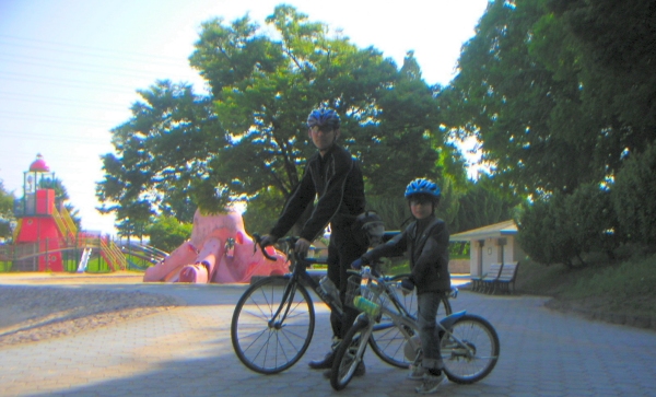 息子が「朝駆けがしたい」と言い出したので、大泉緑地まで朝駆け。今回距離こそ往復12.5kmだったが、その他は私がしている朝駆けとまったく同じようにした。朝は4時過ぎ起床。朝御飯を軽く食べ、自分用のボトルにポカリを詰めさせる。子供用が入らなくなり新調したヘルメットと、グローブ、サングラスという装備も私と一緒だ。5時に出発。西除川沿いに大泉緑地まで走る。緑地内の3箇所の公園を巡り、誰もいない遊具で遊んで予定通り8時半過ぎに帰着。