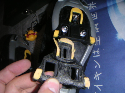 ペダルにワンセット、クリートが付属している。丁度クリートが擦り減っていて交換しようと思っていたところだった。それにしても前のクリートはボロボロ・・・。クリートカバーを購入する前、気にせずにズンズン歩いていたので痛むのが早かったようだ。 |