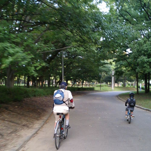 この夏、休日朝の定番となった親子三世代・大泉緑地朝駆け。今日は自宅から大泉緑地までの往復を初めて息子を先頭に立たせて走った。半分は遊びで、半分は交通戦争を生き残る為の指導。例えば「信号が青に変わっても決して油断せず、必ず左右確認せよ」 「”止まれ”と書かれているところは必ず左右確認」 等々・・・。大阪の交通マナーは最悪なので、とにかくここで無事生きていく為には必須の事を教えなければ。今までの指導の甲斐あって、今日は指摘事項はほとんど無かった。大泉緑地では定番の”ツール・ド”・フランス」ごっこ。 |